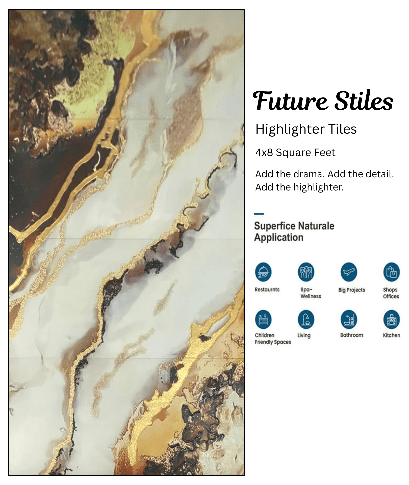Artistic highlighter tiles will turn your dull walls into storytellers. These tiles are globally sourced and precisely crafted, offering tiles that blend design and culture. Their glossy surfaces will create stunning walls and be perfect for statement spaces and accent walls. The radiant colours will help add energy to the interiors. With Future Stiles, every tile will become a brush stroke to complete your elaborate design.