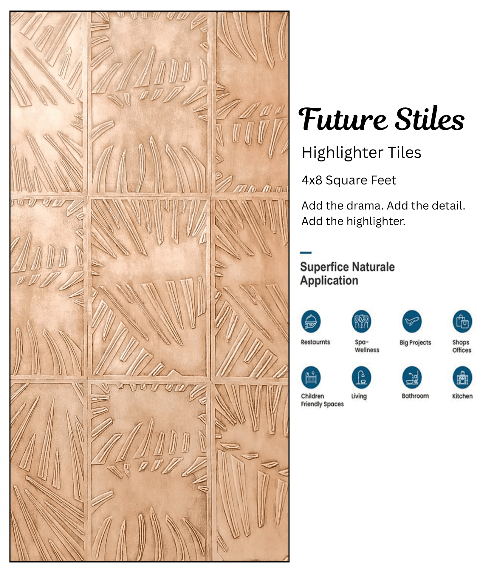 Create contemporary allure in your interiors with Future Stiles’ Highlighter Tiles. These tiles feature sleek lines, metallic tones, and artistic patterns with modern aesthetic in mind. These tiles are perfect for accent walls, adding stylish flair without being overbearing and complementing your decor. They are made from high-quality resources that guarantee longevity and easy maintenance. Enjoy modern design fused with timeless elegance, and watch your walls transform, masterpiece by masterpiece.