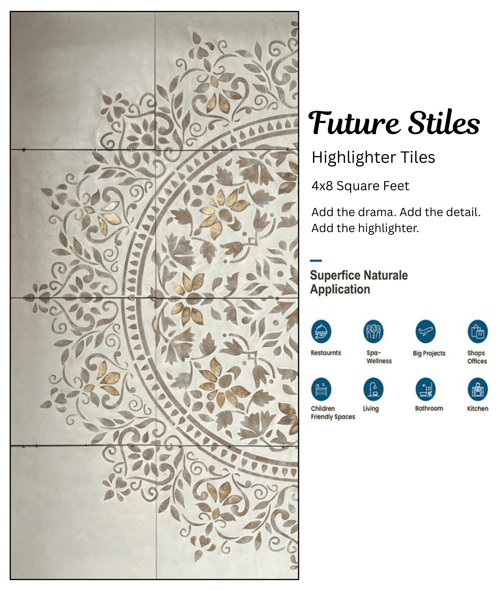 Future Stiles provides highlighter tiles that are made with care, attention, and artistry from their exclusive collection for you. Every single tile is made with the intention of complementing your divine space and focusing attention on that portion of the wall, and thus your home, most. These tiles are perfect complements to your rooms as they go well with floral patterns, minimal embossed textures, marble, or wooden and other traditional decor. Also, the highlighter tiles are perfect for everyday activities and burning of incense as they are durable, stain-resistant, and easy to clean.