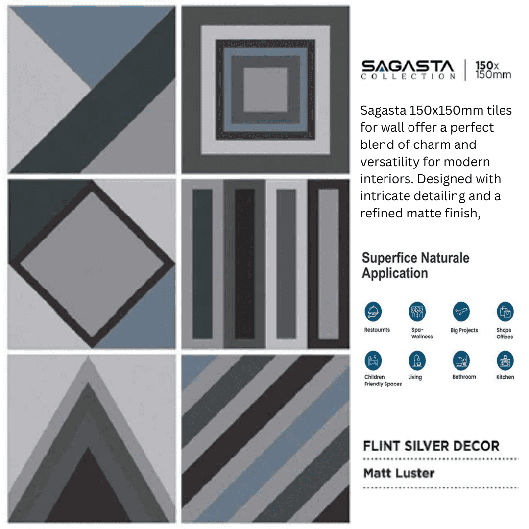 Elegance meets functionality with the Sagasta 150x150mm wall tiles. Compact tiles create aesthetically pleasing patterns on walls while adding depth and character. Refined and classy, these tiles suit the bathrooms, kitchens, living rooms, and even commercial spaces. Crafted to perfection, Sagasta wall tiles are designed to have the same texture and finish for uniformity. Their surfaces are easy to clean and are suitable for high-traffic areas. Sagasta tiles come in artistic, rustic, and modern patterns and designs, encouraging endless creative possibilities. Transform a room with an attention-grabbing feature wall, or even a subtle backdrop. There are many layout options with the 150x150mm tiles, like a grid, stack bond, and mixed options. If you need something that screams sophistication and versatility, look no further than the Sagasta tiles