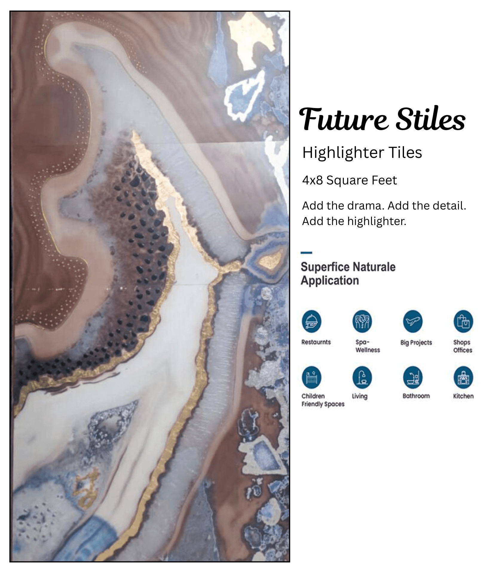 The highlighter tiles with gold accents make spaces look sleek and more regal. The gold, metallic shimmer is perfect for more sophisticated spaces like living rooms, dining rooms, and spa-like bathrooms. These tiles make your room look richer and more opulent, while also enhancing the brightness of the room with the reflective surface. Visit Future Stiles to appreciate and create designs that reflect your bold style and artistic charm.