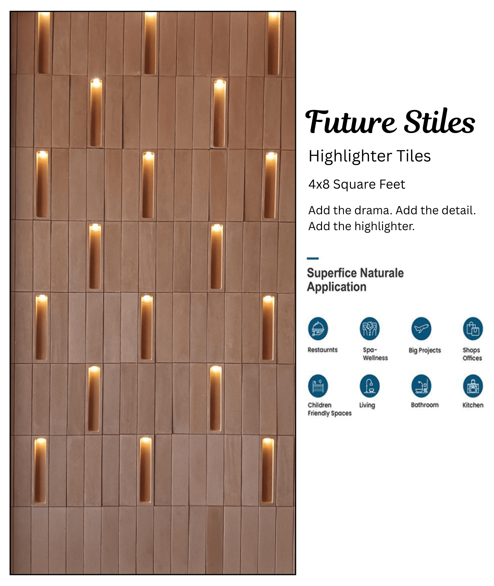 Draw attention to your favorite spaces, and introduce our wall Highlighter Tiles. Each selection deepens and refines the feel of the area. These tiles can be used to frame mirrors, facilitate the edges of the kitchen, or enhance the living room focus. These tiles are designed to be durable, keeping any area lively and modern for many years to come. They are perfect for any commercial or domestic spaces since, without a doubt, they are the best way to make a wall a centerpiece..
