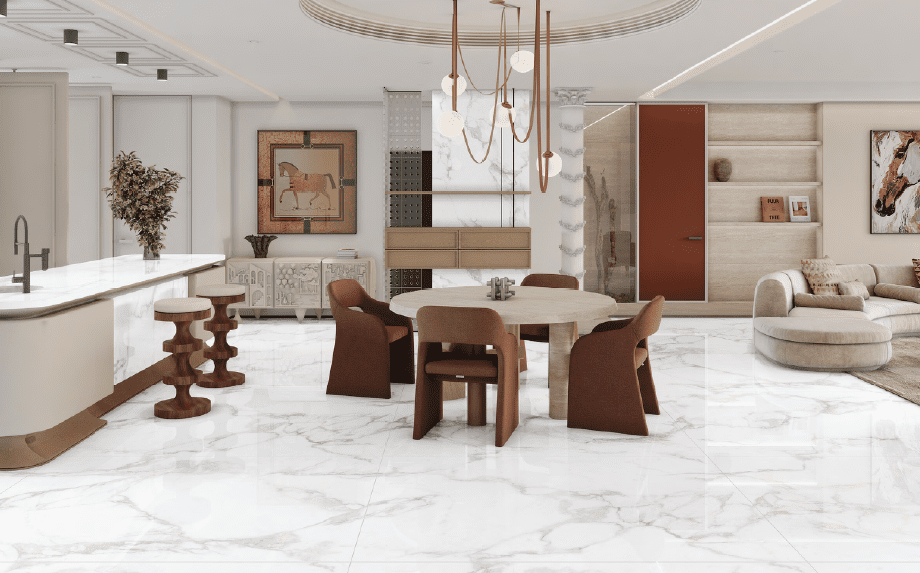 The unified flow and premium feeling these tiles deliver can enhance any setting. These floor tiles have dimensions of 1200x1800mm, which can be used for spacious living rooms, lobbies, and any other commercial areas, and serve as an epitome of grace and charm. The reduced grout lines of these tiles, along with their oversized design, help with ease of movement and overall elegance of the setting. The tiles come in high gloss marble and other textures, such as rustic stone, meeting every design need. These tiles represent practical sophistication in every step taken on them. It’s practicality, along with astonishing style, that makes these tiles stand the test of time.