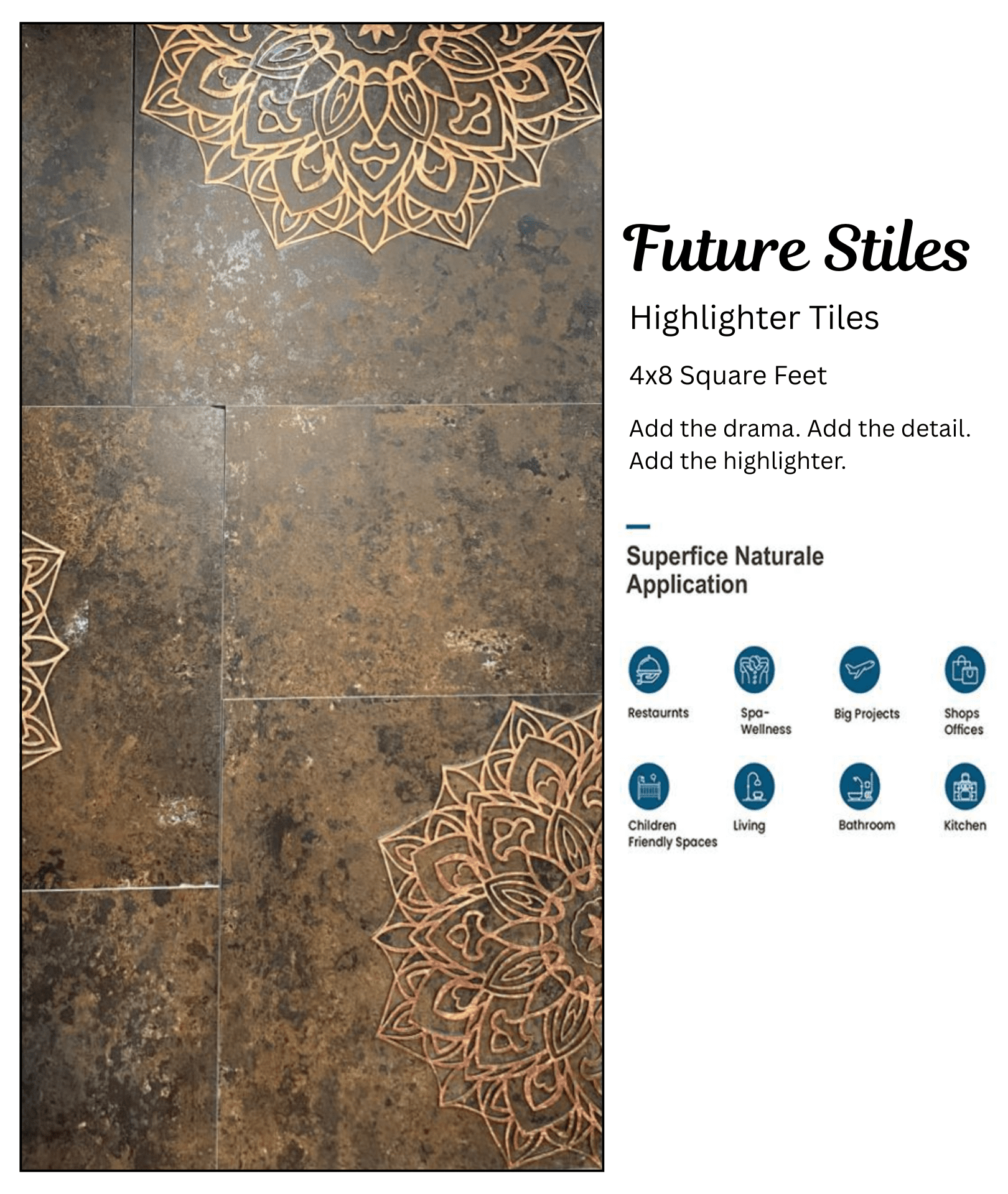 Incorporate spectacular accent walls in your interiors with our Designer Highlighter Tiles collection. From an aesthetic, highlighter tiles also add character to the design. Be it a masculine ambience with geometric, metal, and jewel tones or the charm of the Mediterranean with hand-painted, Moroccan, inverse colors prints, the tiles add character to every design. The addition of Highlighter Tiles to walls or accent pieces adds physical as well as psychological drama to an otherwise understated design. From living rooms and lobbies to bathrooms, the collection is bound to provide character, elegance, and class to any design