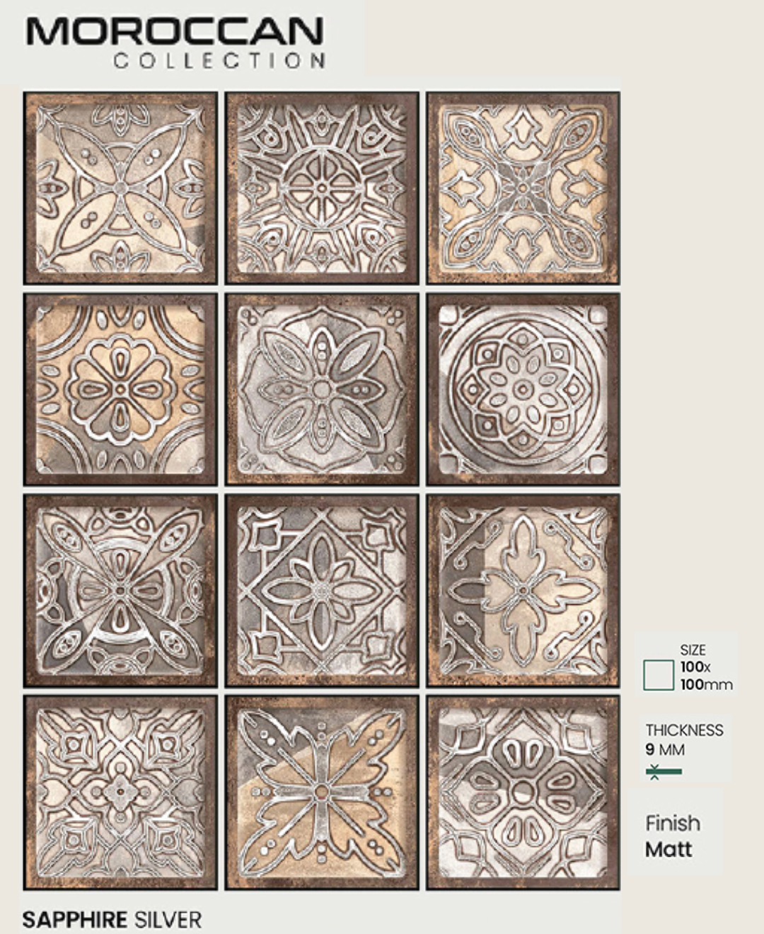 Sapphire Silver 100x100mm Moroccan Tiles: Handcrafted Elegance for Every Space