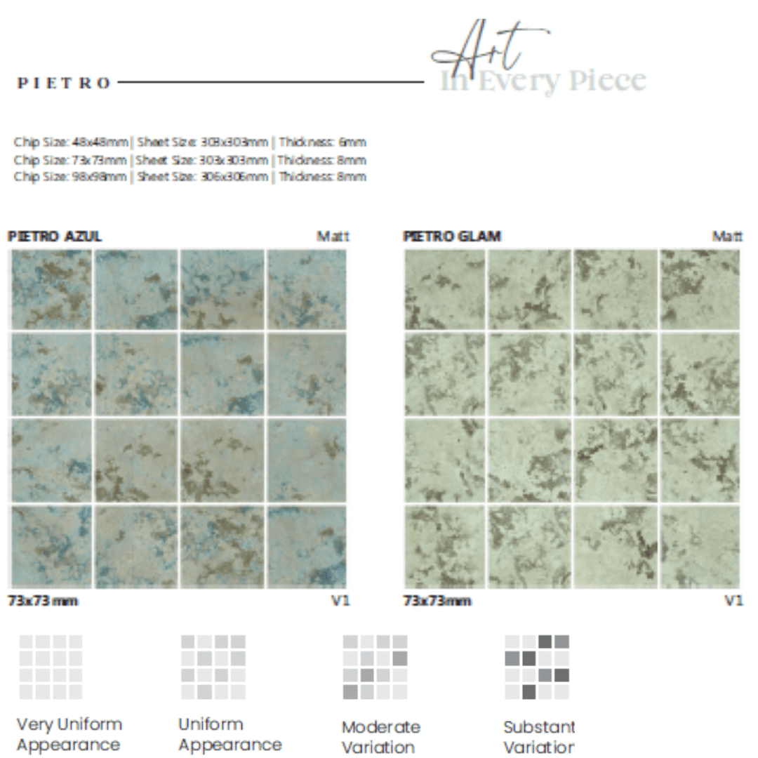 | Mosaic Tiles Matt Finish | Earth Blue, Earth Green, Emarald Green, Meraki Nile blue, PIETRO, Sapphire Green, Sonet Blue, Spoto, Spoto 3 |