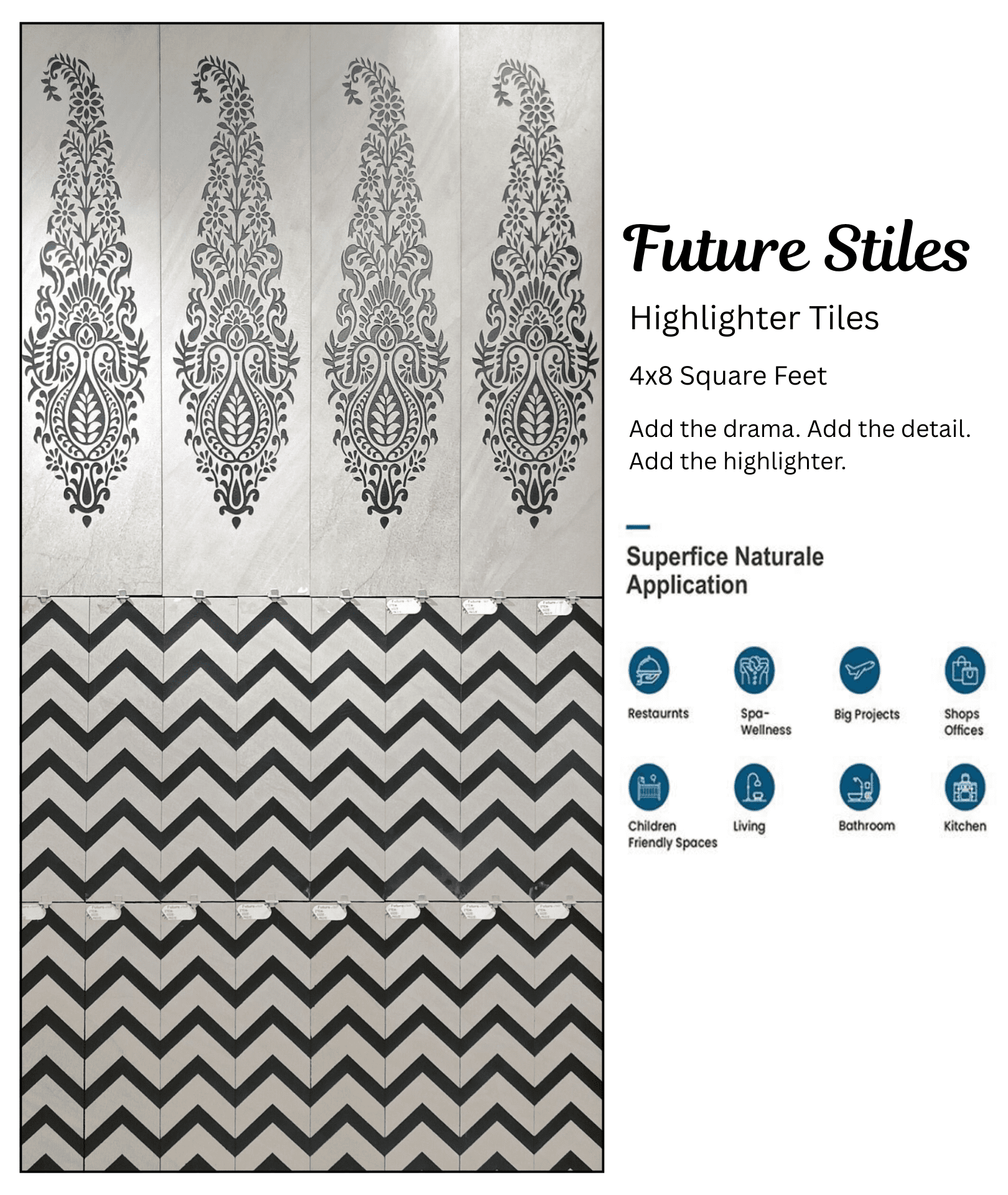 Bring magic to your walls with Future Stiles’ Highlighter Tiles. Their detailed craftsmanship and vibrant appeal make them a top choice for modern interiors. Whether you want a subtle shimmer or bold statement, these tiles adapt beautifully to your vision. Perfect for living rooms, kitchens, or commercial walls, they redefine how spaces look and feel. Make every glance at your wall a moment of admiration.